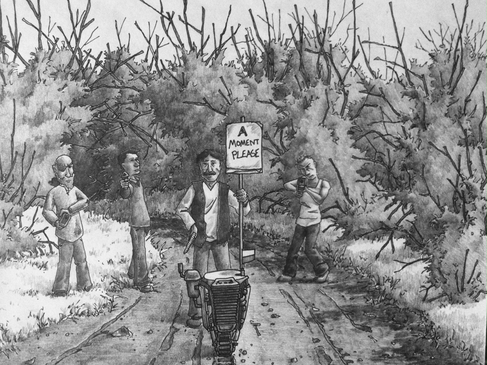 The boy had managed to pull his own rifle from the back of the tractor and held it pointing towards the group of men, almost managing to keep it from shaking. The man in front looked to be the group’s leader. He had long dark hair, a bushy mustache, and held a sign that read “a moment please.”